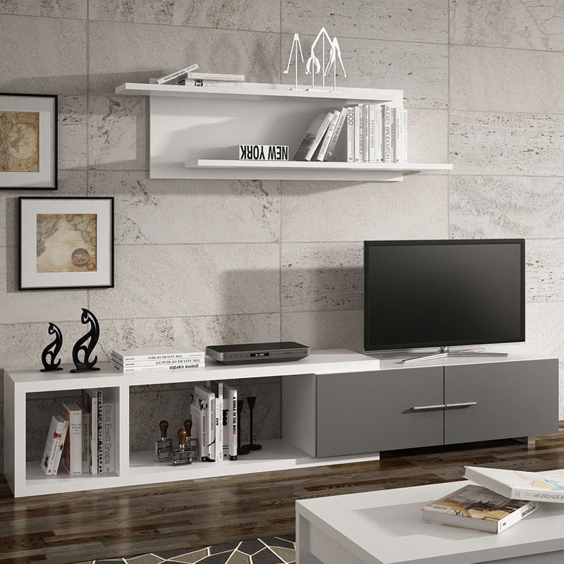 Práctico mueble de salón ya que se puede adaptar a medidas reducidas,sirve para una pared de poco menos de dos metros como un poco mas grande hasta llegar a 2.40 cm. También disponible en cambrián o wengué combinándolo en color grafito o blanco.