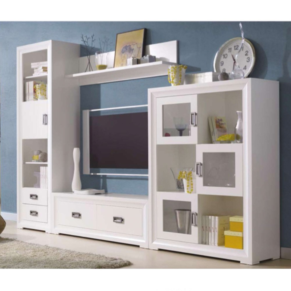 Esta composición, fabricada en madera dm lacada blanca de 2.90 cm. consta de vitrina, de mueble de t.v., de alacena y de estante de pared. Sus módulos se pueden obtener por separado, habiendo variedad de ellos.