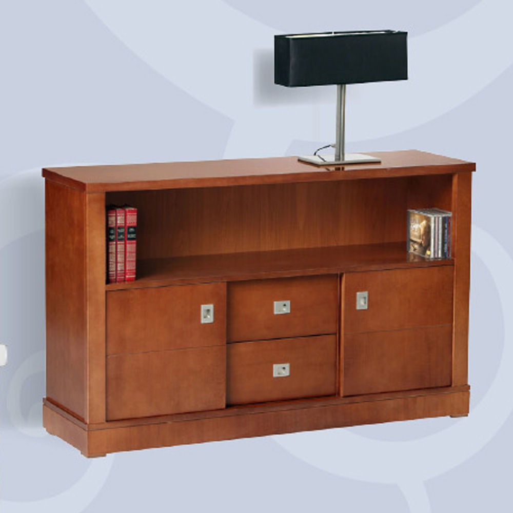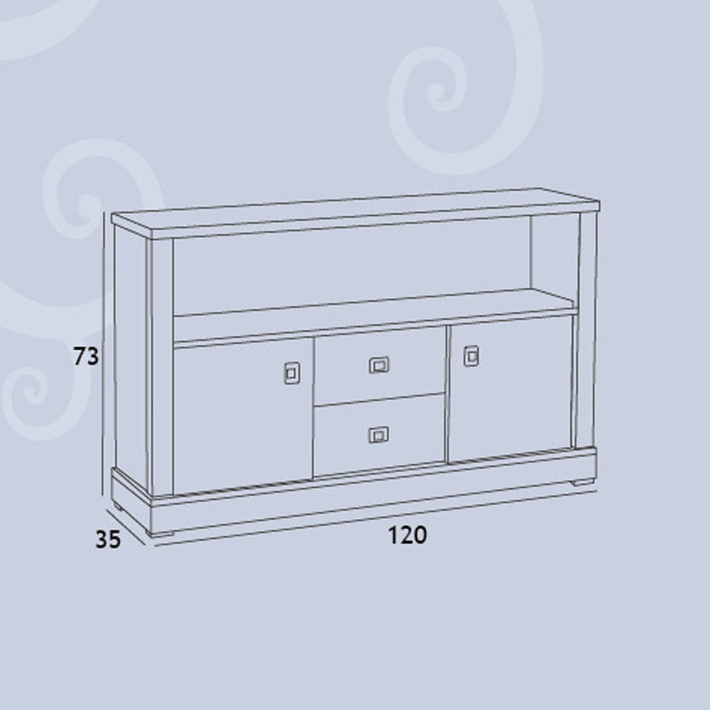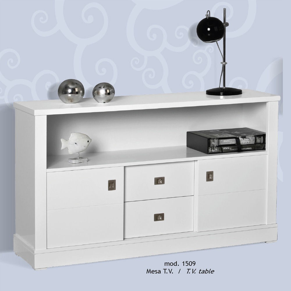 Mesa de televisión con dos puertas correderas y dos cajones.